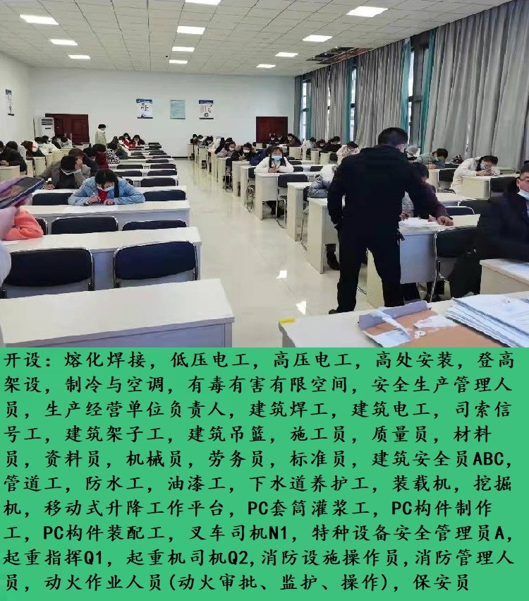 開(kāi)設(shè):熔化焊接,低壓電工,高壓電工,高處安裝維護(hù)拆除,登高架設(shè),制冷與空調(diào),有毒有害有限空間,生產(chǎn)管理人員,生產(chǎn)經(jīng)營(yíng)單位負(fù)責(zé)人,建筑焊工,建筑電工,建筑起重司索信號(hào)工,建筑架子工,建筑吊籃,施工員,質(zhì)量員,材料員,資料員,機(jī)械員,勞務(wù)員,標(biāo)準(zhǔn)員,建筑員ABC,管道工,防水工,油漆工,變電設(shè)備安裝工,線(xiàn)路架設(shè)工,下水道養(yǎng)護(hù)工,裝載機(jī),挖掘機(jī),移動(dòng)式升降工作平臺(tái),PC套筒灌漿工,PC構(gòu)件制作工,PC構(gòu)件裝配工,PC模具工,PC質(zhì)檢工,叉車(chē)司機(jī)N1 ,特種設(shè)備管理員A,起重機(jī)指揮Q1,起重機(jī)司機(jī)Q2,(消防設(shè)施操作員(監(jiān)控/維保),消防管理人員(消防責(zé)任人/管理人,動(dòng)火作業(yè)人員(動(dòng)火審批、監(jiān)護(hù)、操作),保安員